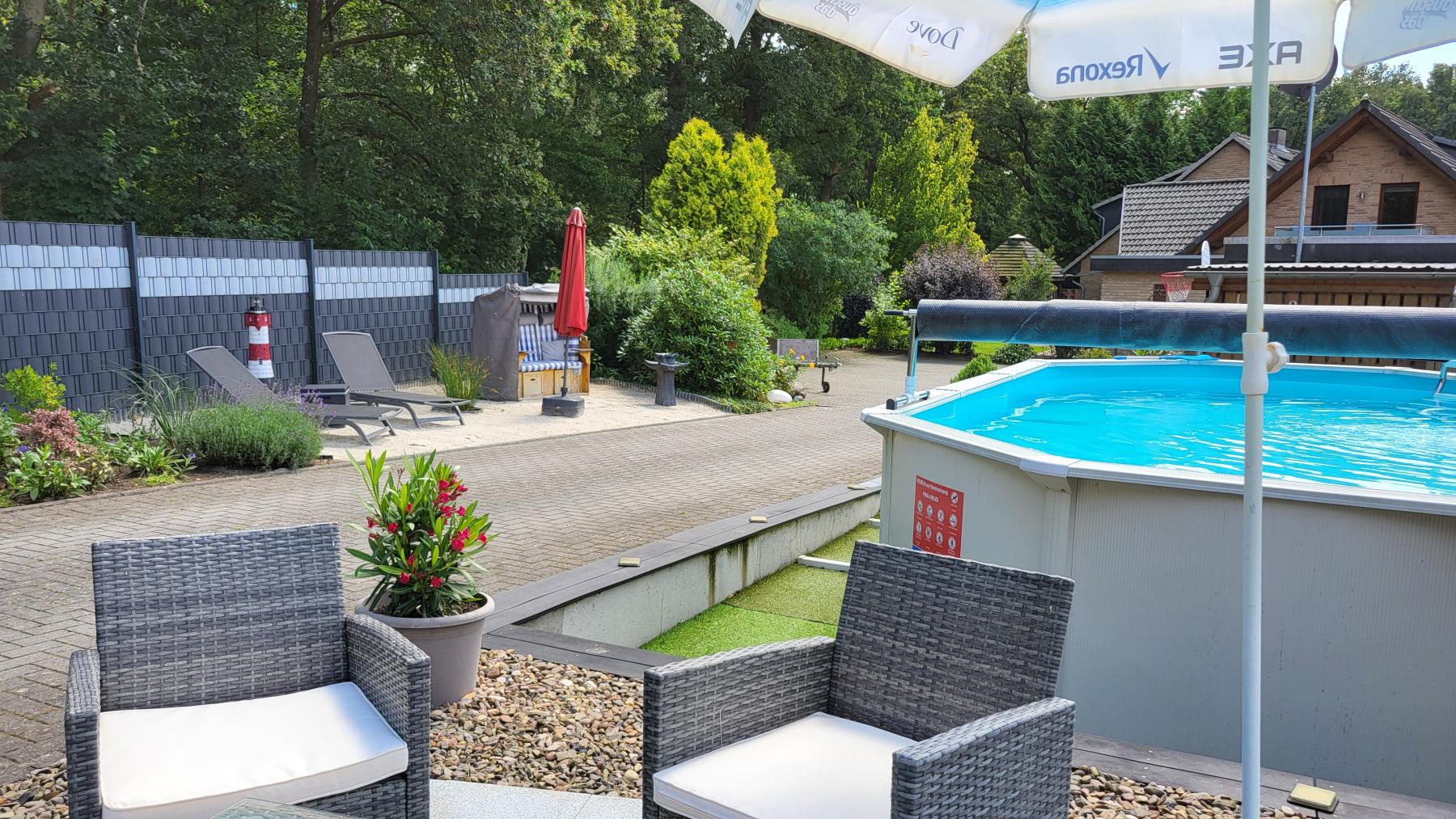 Zu unserer Anlage gehören ein großer Grillplatz und ein Wellnessbereich mit Strandkorb, Liegen und Pool.